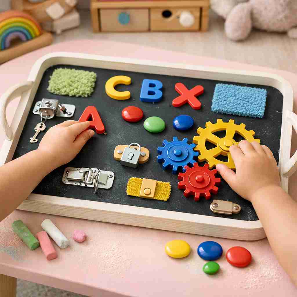 Paint the tray with chalkboard or magnetic paint and add interactive elements like gears or textures. Perfect for hands-on learning and creative play.