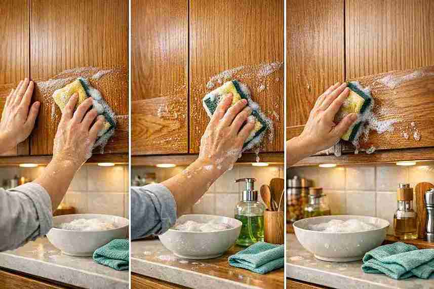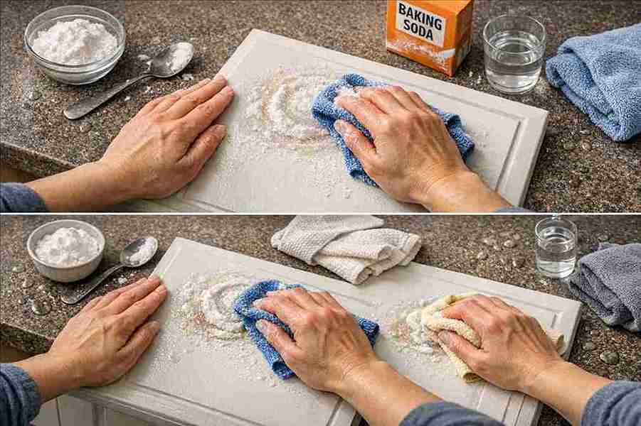 Important: Test this method on a small hidden area first — baking soda can be slightly abrasive on certain cabinet finishes.