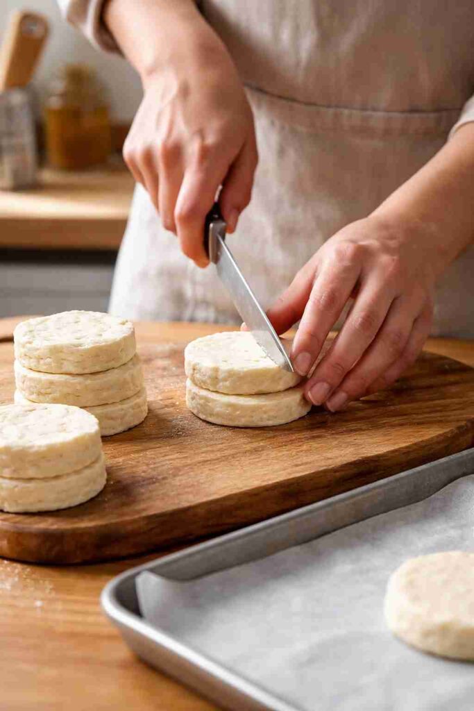 To begin, the oven is preheated to 400°F, and a baking sheet is lined with parchment paper to make cleanup simple and stress-free. Each refrigerated biscuit is sliced horizontally, creating two halves and instantly doubling the number of servings.