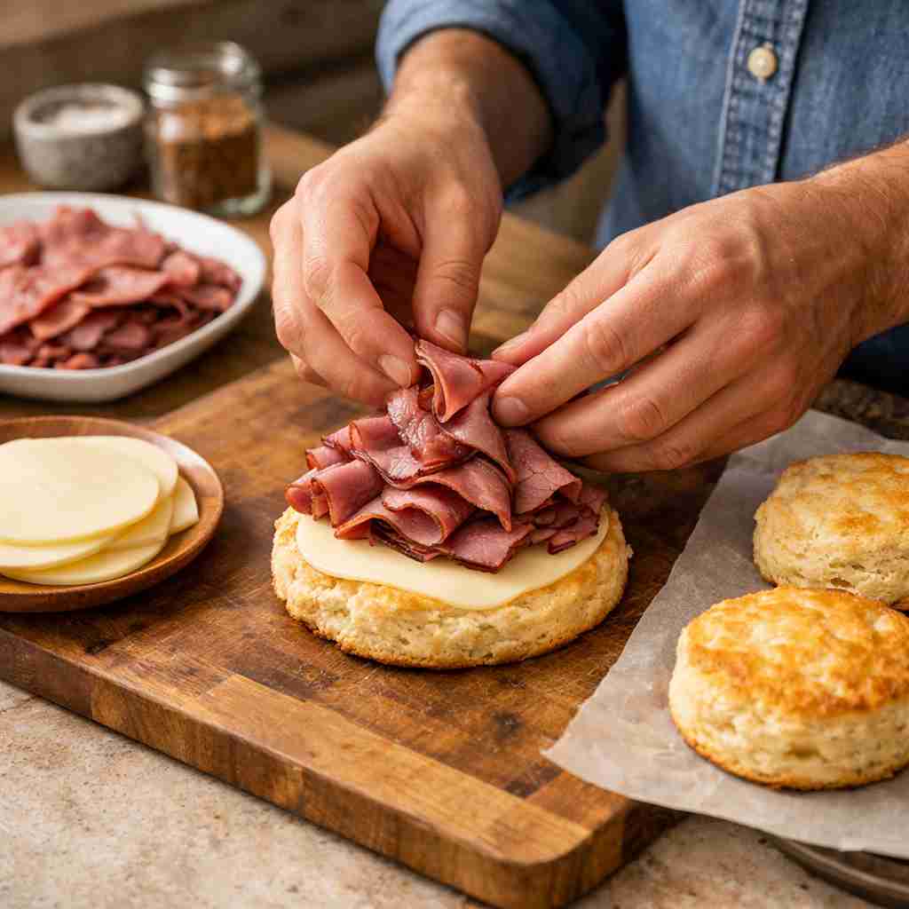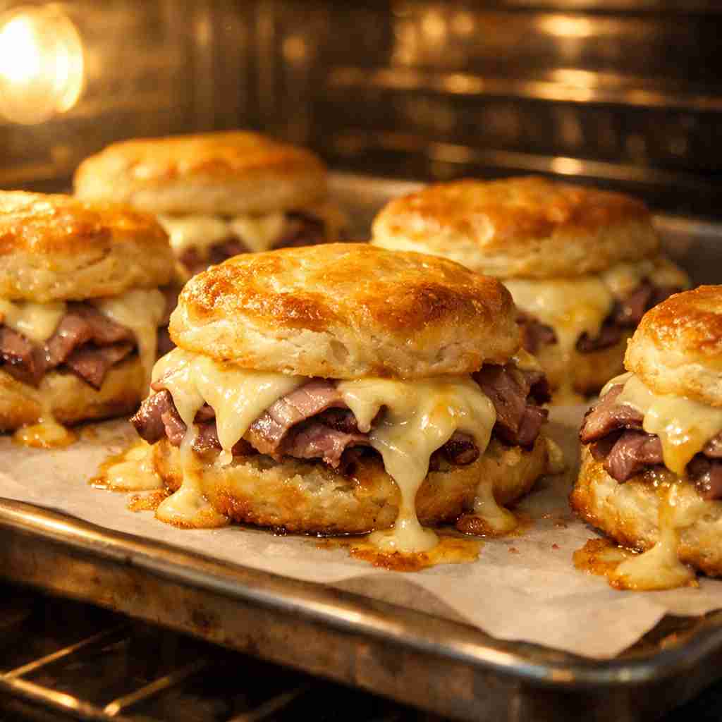 As the biscuits bake, the cheese melts into the roast beef, helping hold everything together while adding smooth, savory richness. The top halves of the biscuits are placed back on, and the edges are lightly pressed to seal in the filling. After 12 to 15 minutes in the oven, the biscuits come out golden, flaky, and perfectly warm.