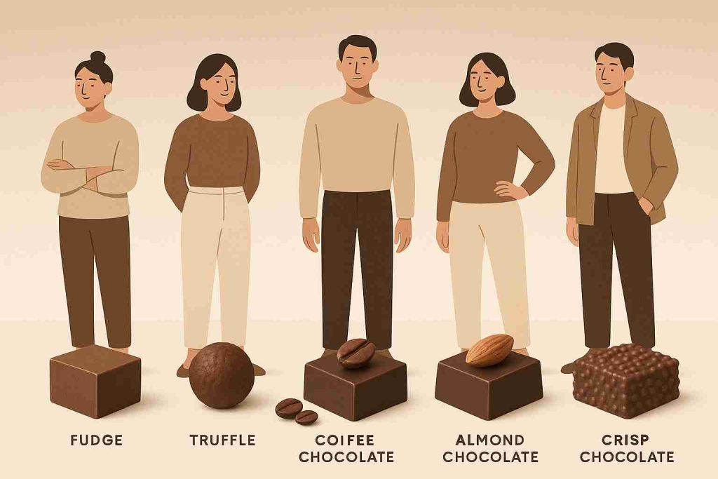 Fudge lovers appreciate simplicity, truffle fans think deeply and observe quietly, coffee-chocolate lovers stay focused and driven, almond fans remain practical and steady, and crisp-chocolate lovers bring lighthearted and playful energy wherever they go.