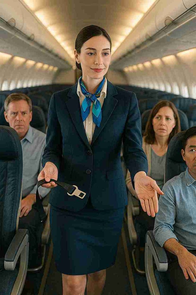 As she made her way down the aisle checking seatbelts, Ananya reached Rakesh’s row and politely said, “Sir, please fasten your seatbelt.”