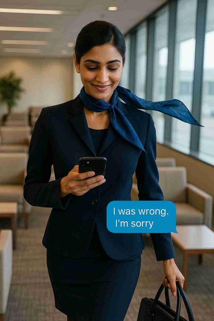 She stared at it briefly, then smiled softly, deleted the message, and walked away — her scarf fluttering as she stepped confidently into her next flight.
