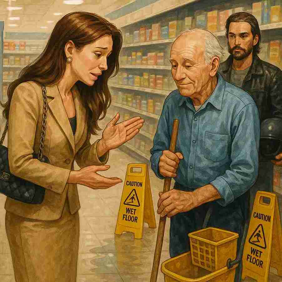 One evening, while I was mopping an aisle, a wealthy customer walked in while talking loudly on her phone. She did not notice the bright wet floor signs and stepped right past them, slipping just enough to scare herself. Instead of calming down, she turned toward me with sharp frustration and accused me of “not doing my job properly.” I apologized right away, even though the signs were clearly placed.