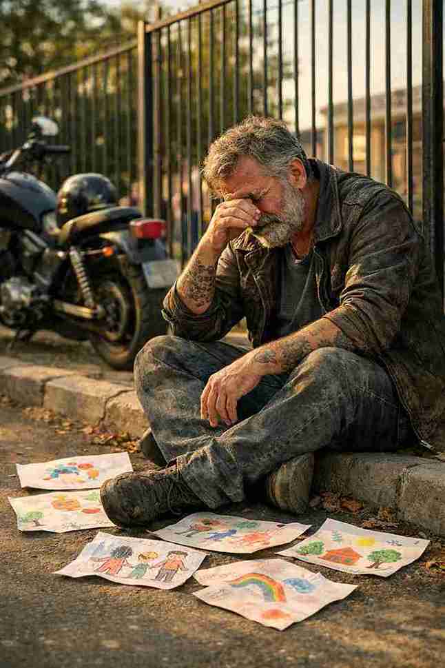 The officers then asked me to step outside. A small crowd had gathered near the school entrance. Sitting on the curb was an older man with a long beard, tattoos on his arms, and worn leather clothes. He was crying openly. Around him were small toys, colorful drawings, and handwritten notes.