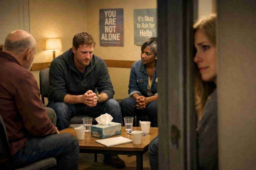 Inside, a group sat in a circle. Then I heard Ryan’s voice. His shoulders were shaking as he spoke about the delivery room—how he thought he was losing me, how he feared he couldn’t protect us, how every time he looked at Lily he saw the moment he almost lost everything.