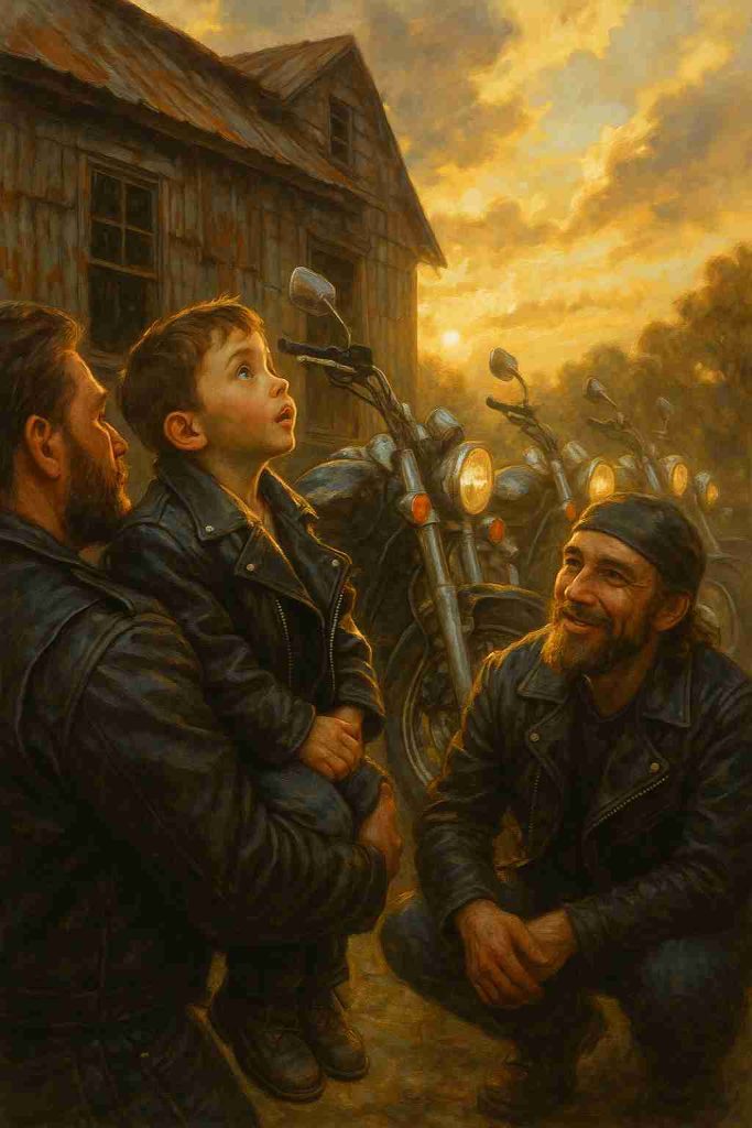 We didn’t expect to find a child when we shoved the rotted door open. Six of us — big bikers in leather — stumbled into a little room thick with dust. The boy didn’t look up. He was drawing circles in the dirt with his finger like none of us were real.