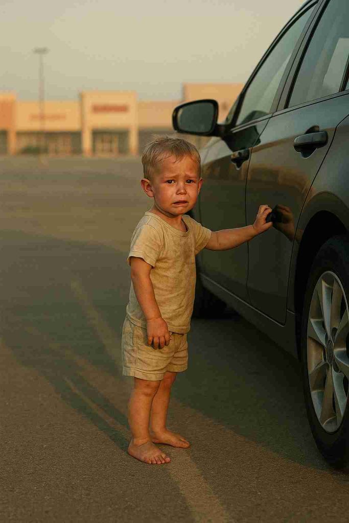 It started like any regular afternoon—sun shining down, the buzz of cars and chatter in a shopping mall parking lot. Nothing unusual, until something stopped us in our tracks. A tiny boy, no older than two or three, stood barefoot beside a black car. His small body trembled, his skin burned red by the heat. He clung tightly to the door handle of the locked vehicle, as if it was his only hope.