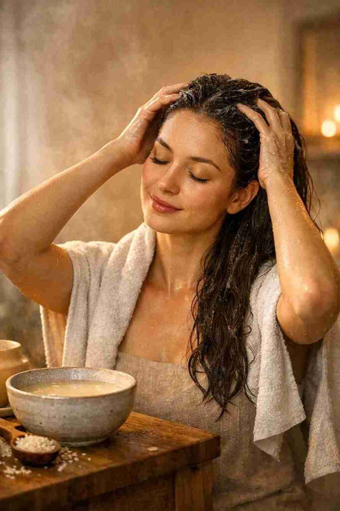 Rice water can also work wonders for your hair. Store the water at room temperature in a ceramic or porcelain container (avoid glass). After about 10 days, it will develop a slightly sour smell — this means it’s ready. This fermented rice water contains vitamins A, B, and C, which help strengthen hair, reduce split ends, and enhance shine. Massage it into your scalp twice a week, then rinse with clean water for healthier, more vibrant hair.
