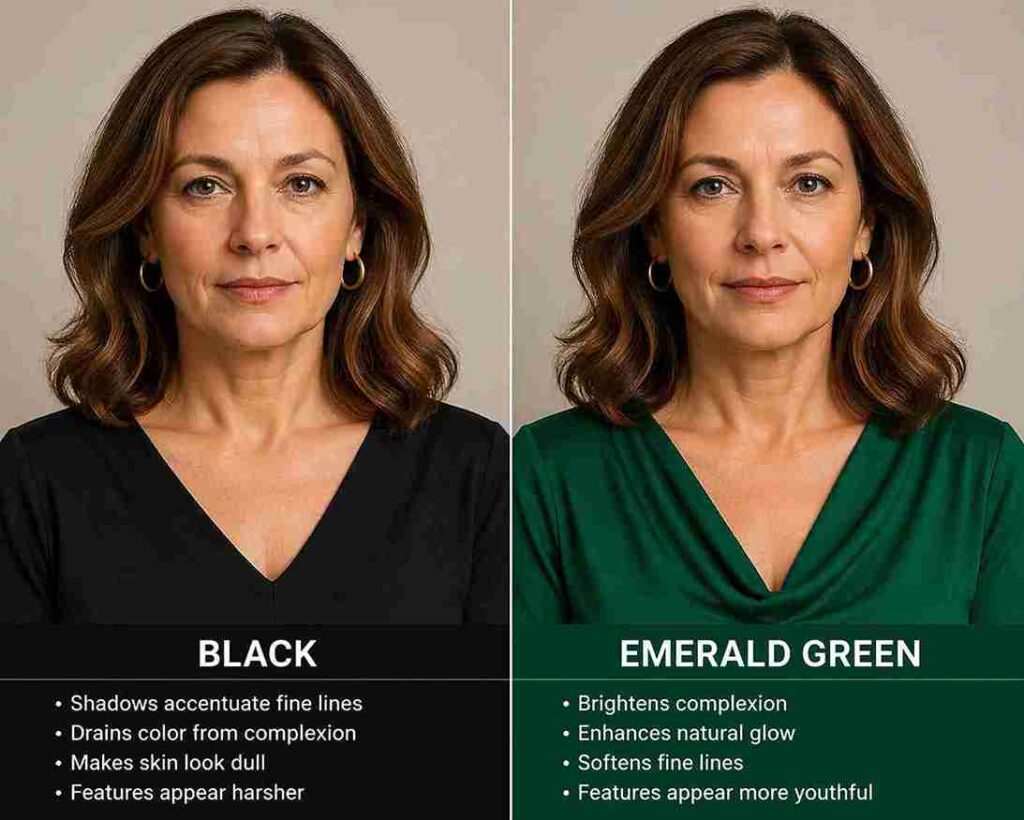 This effect is especially noticeable in indoor lighting or when worn close to the face. While black and navy are not “bad” colors, wearing them carefully can make a big difference.