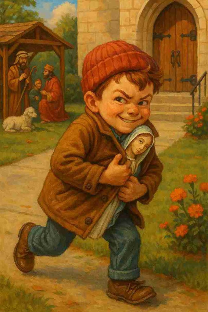 Outside the local church, he spotted the nativity scene. A mischievous idea struck. Looking around carefully, he gently picked up the statue of Mary, tucked it under his coat, and ran home.