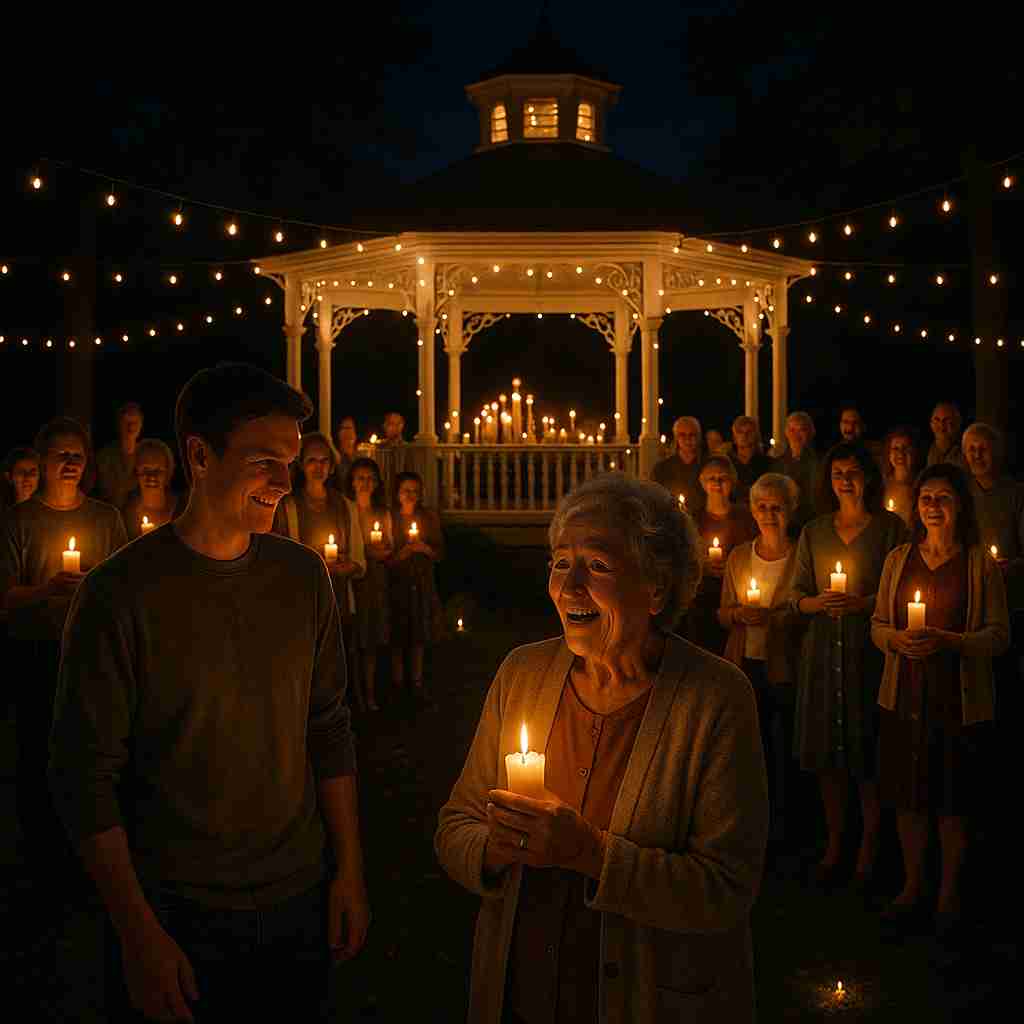 In front of her stood their entire family—her children, grandchildren, cousins, and friends—holding glowing candles under strings of soft, twinkling lights. The air was quiet, warm, and full of love. Then, a familiar tune began to play. It was their song—the one she and her late husband had picked for their first dance. But they never had that dance. Their wedding had been a simple courthouse ceremony, without music or a reception.