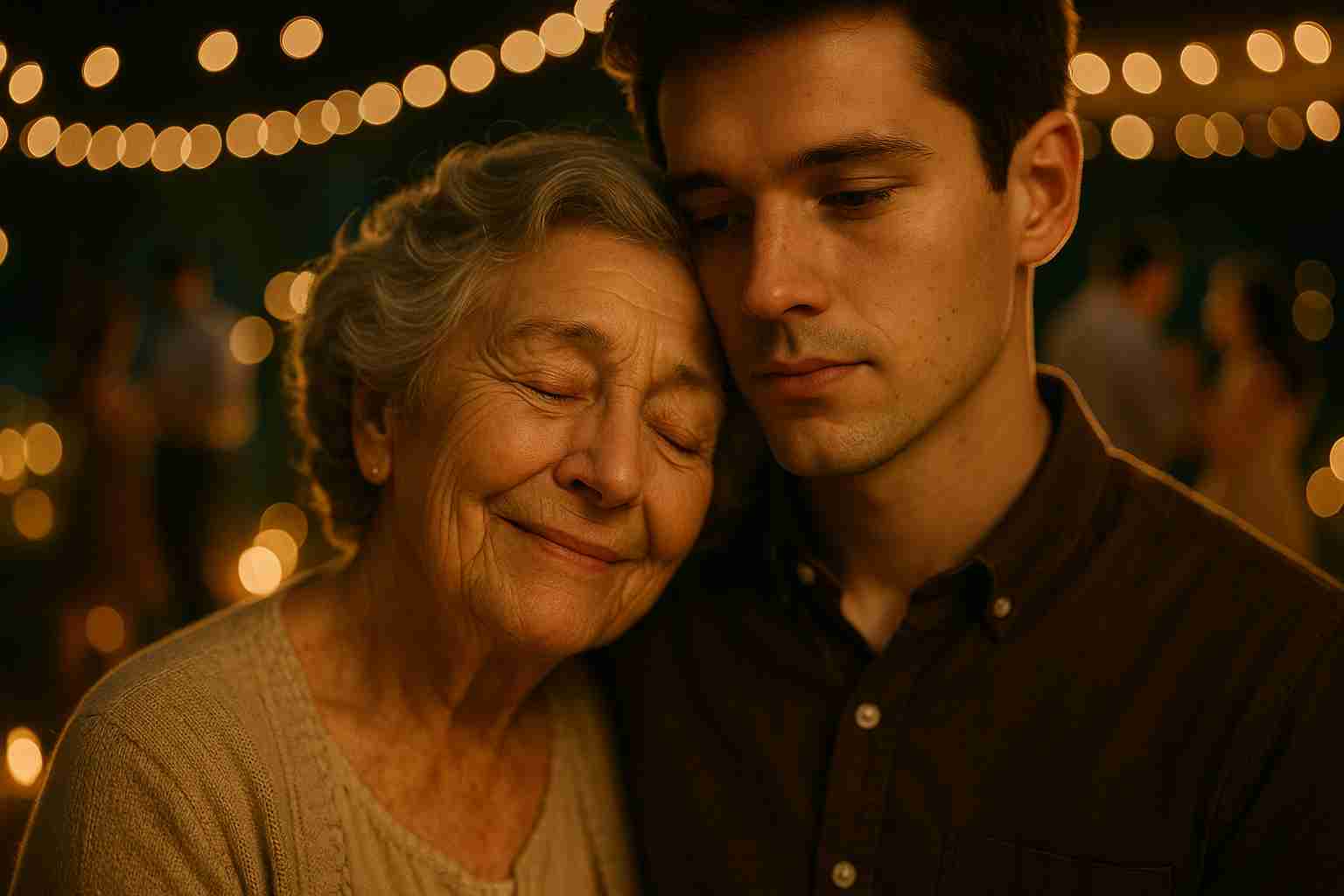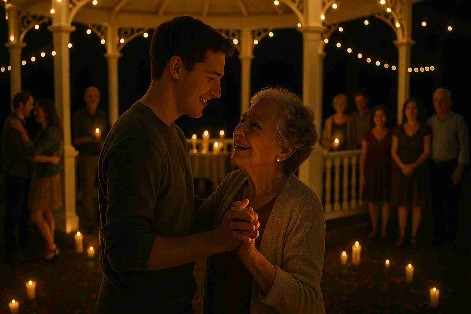 With tears rolling down her cheeks, Margaret took his hand. The crowd moved aside, and under the starlit sky, Jake slowly led her into a soft, graceful waltz. For a moment, the illness melted away. In her grandson’s arms, Margaret found strength—and peace. The music, the candles, the faces she loved all around her—everything came together to create something unforgettable.