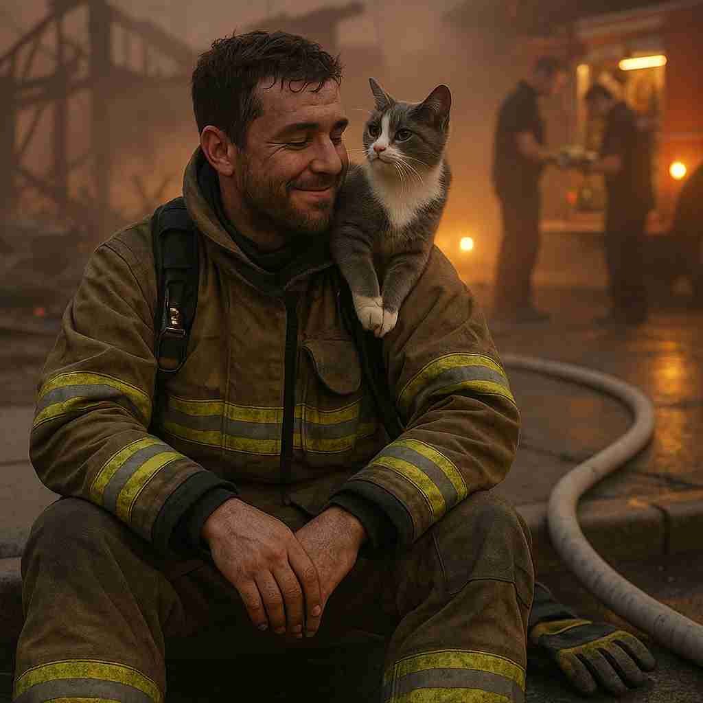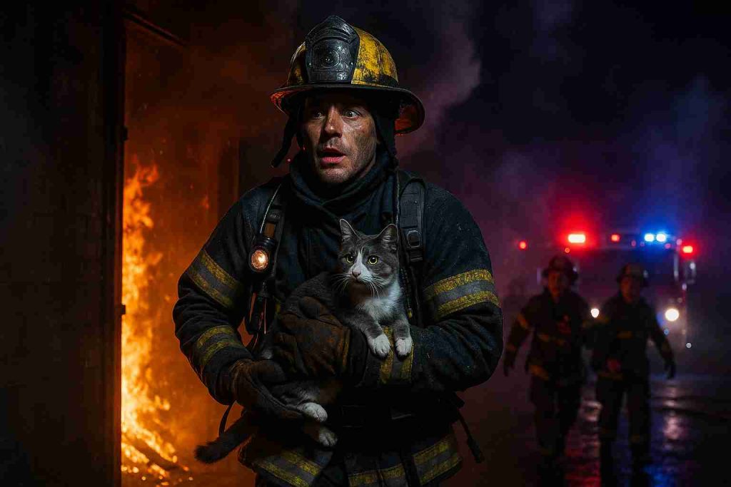 When he finally burst into the open air, his crew thought he had been searching for victims or flare-ups. Instead, he carried a soot-covered, frightened cat clinging tightly to him. No one expected that.