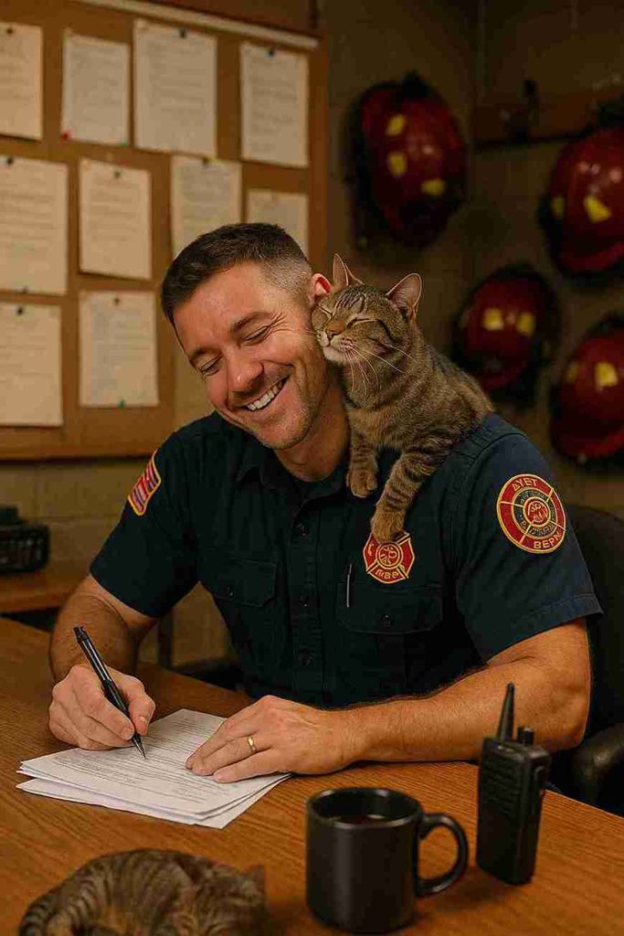 From that day on, she became his shadow. She perched on his shoulder at the station, curled in his lap while he did reports, and even napped on his turnout gear. The crew affectionately nicknamed her Ashes, but Dervishi prefers calling her Luna.