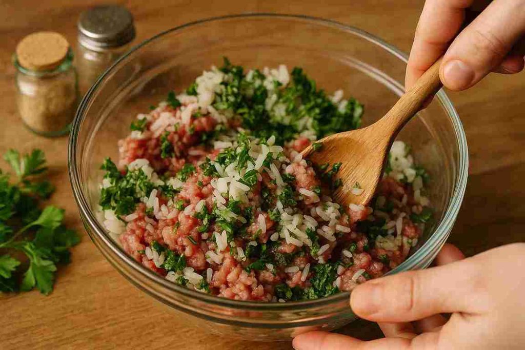 In a large bowl, mix together the ground meat, cooked rice, diced onion, garlic, egg, paprika, thyme, salt, and pepper. Stir until combined but do not overmix — this keeps the filling light and tender.