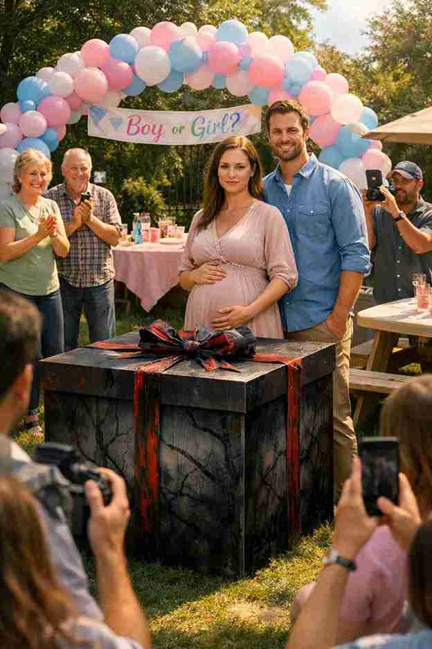 “The backyard set for a joyful gender reveal — with a secret twist waiting inside the box.”