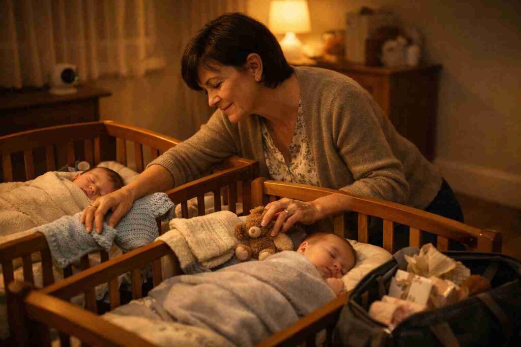 My breath caught as she approached the cribs with a small duffel bag. Fear rushed through me, but instead of anything dangerous, she gently pulled out hand-knit sweaters and small toys. Leaning over the twins, she whispered softly, “Just one picture for Nana.”