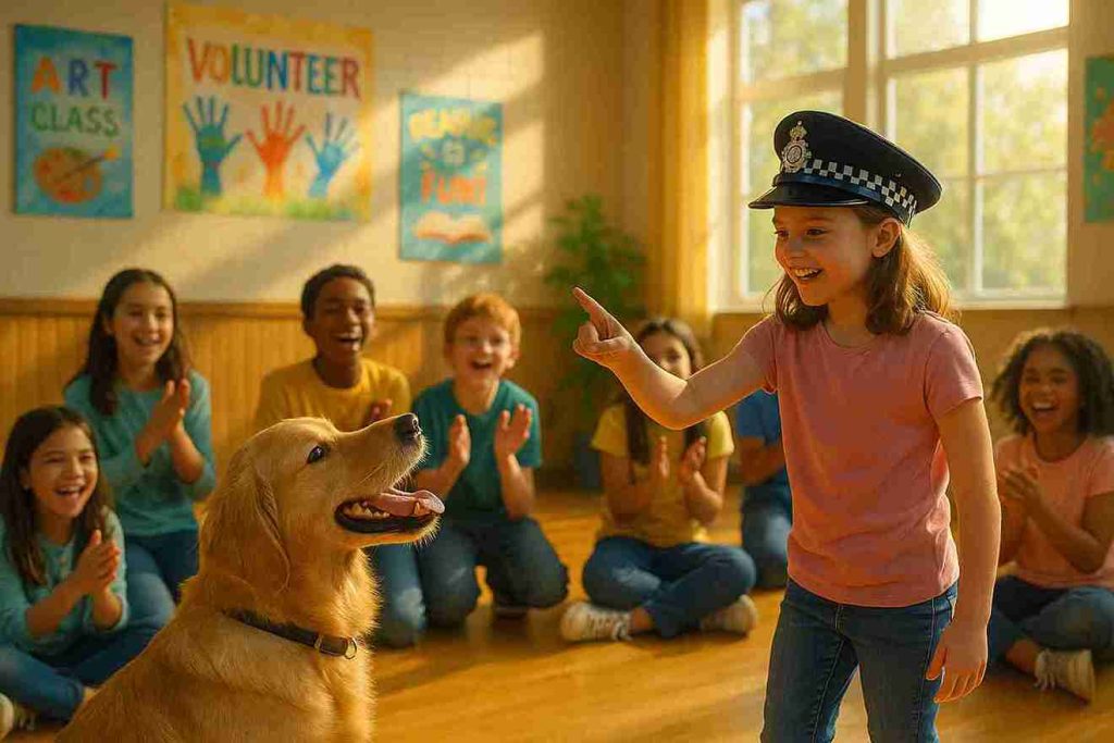 The next morning, Lily woke up with new strength in her heart. She brushed Max’s fur, placed her mother’s police hat on her head, and walked to the community center. Word of her story had already spread. When she asked for a small stage to speak, the staff gladly agreed.