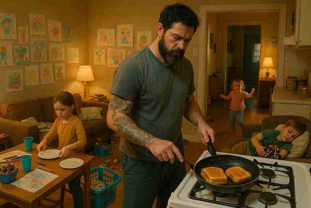 That night, back in their cozy home, Dez made grilled sandwiches. Brin helped set the table, Roux danced around the hallway, and little Callum fell asleep on the couch, clutching a toy motorcycle. The house echoed with laughter.