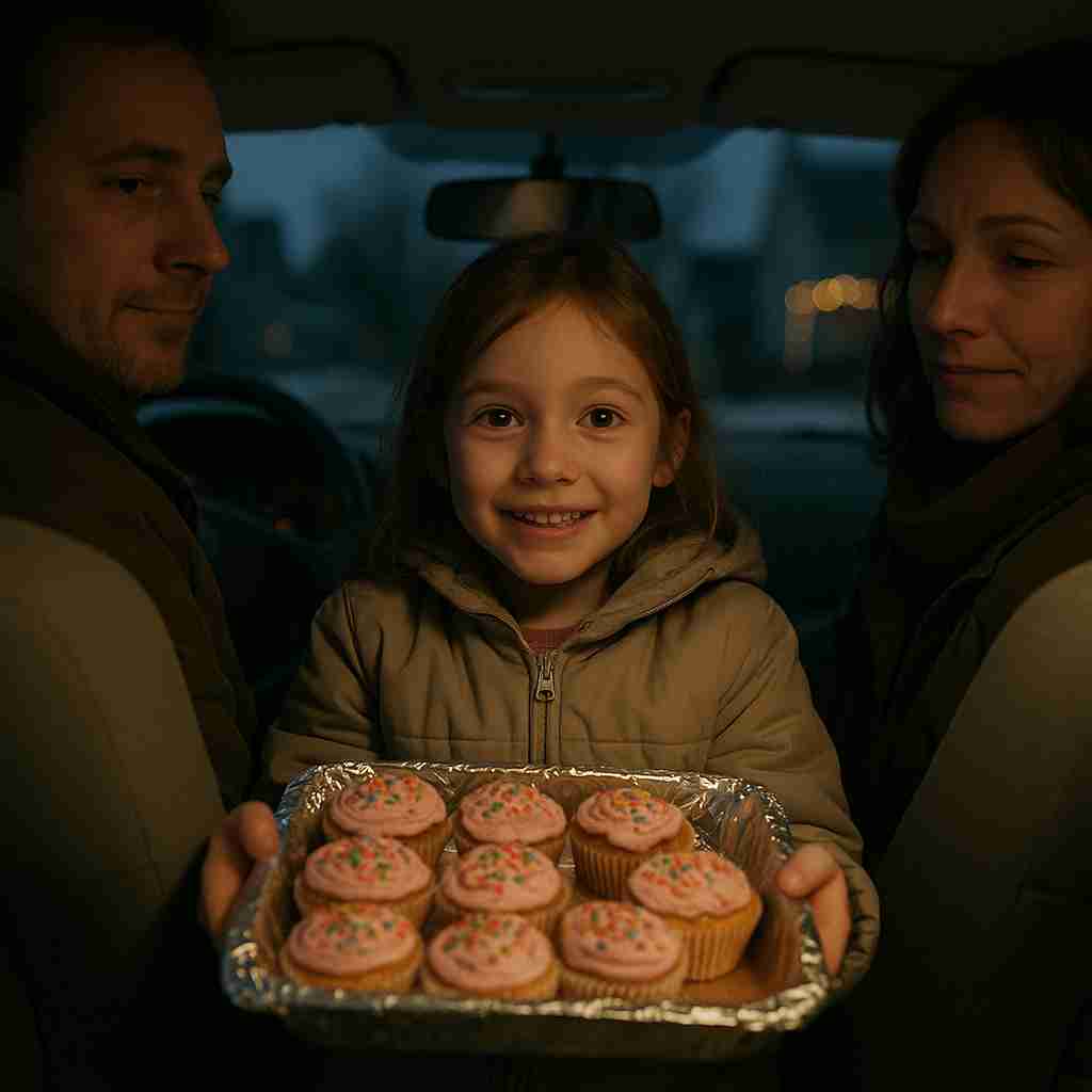 In the back seat, our daughter Chloe held a foil-covered tray like it was the most precious thing in the world. She had spent hours baking cupcakes for her grandmother. Four batches, four attempts. Burnt, flat, crumbled — until finally she created a tray full of pink-frosted cupcakes that were beautifully imperfect.