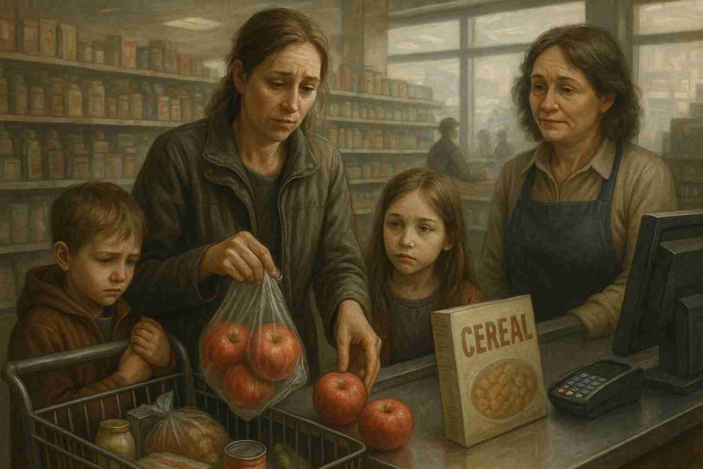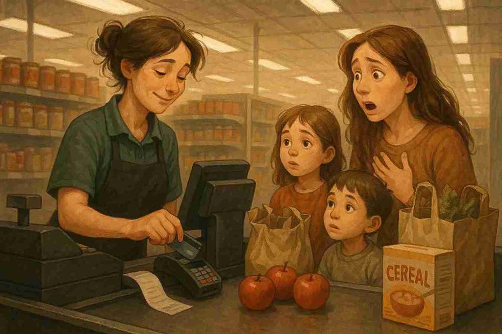 Her groceries were simple: milk, bread, apples, cereal, canned goods. When I told her the total, she hesitated. She reached slowly into her pocket like she was bracing herself for disappointment.