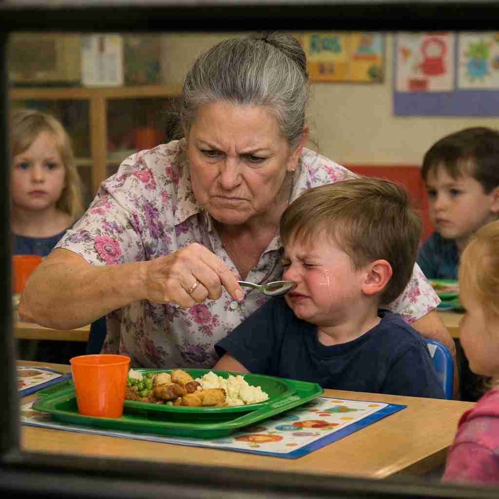 Later that morning, I returned early and looked through the dining room window. What I saw froze my entire body. A woman with a tight gray bun—someone I had never seen before—pressed a spoon against Johnny’s mouth while he cried silently. “You’re not leaving until that plate is empty,” she said sharply.