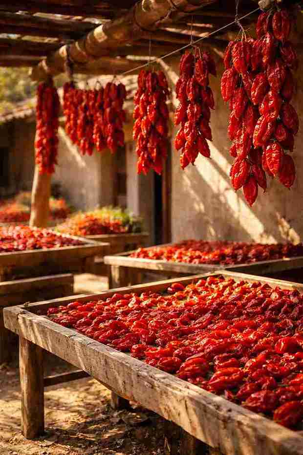 The process is simple but precise. Peppers are harvested only when they reach a vibrant, full red color. They are then dried slowly, either in the sun, in controlled drying rooms, or over smoke, depending on the desired flavor. This slow drying helps preserve their color, aroma, and natural sweetness.