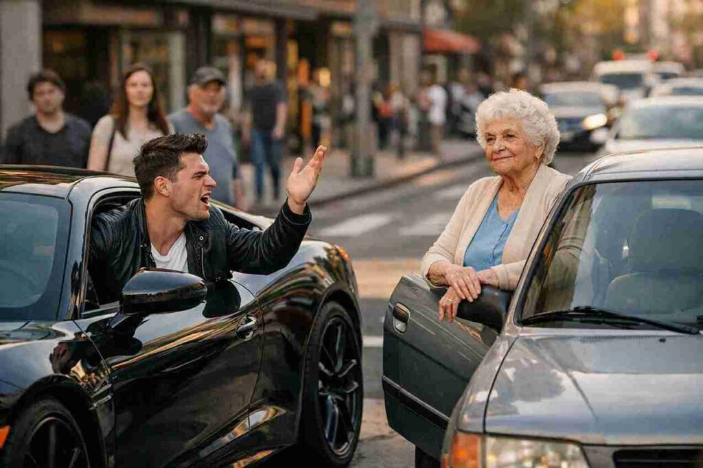 The second moment unfolds on a busy street, sparked by impatience and pride. A young man in a luxury car becomes frustrated because an elderly woman in an older vehicle won’t rush for him. Feeling entitled, he pulls over to confront her, expecting fear or apology. Instead, he is met with steady confidence and a calm response that completely flips the situation. Her words quietly remind him that experience and composure often hold more strength than loud anger or a fancy car.