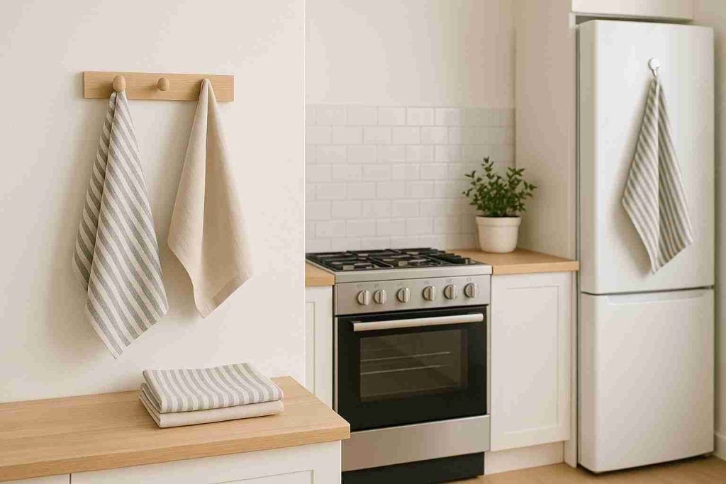 - A dedicated towel rack or magnetic hook on the fridge
